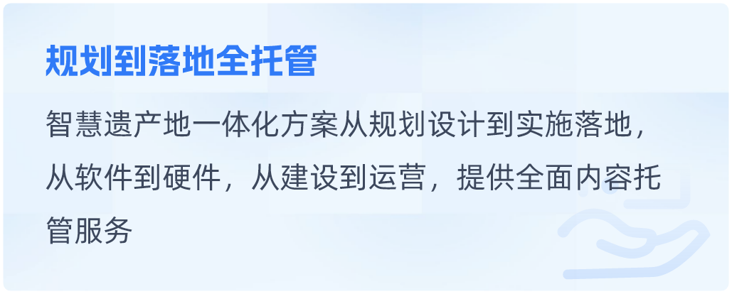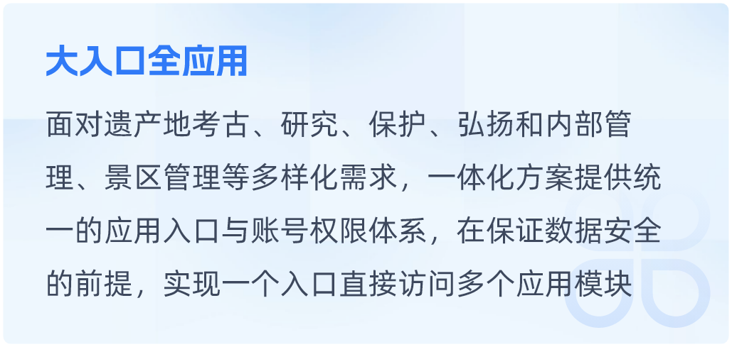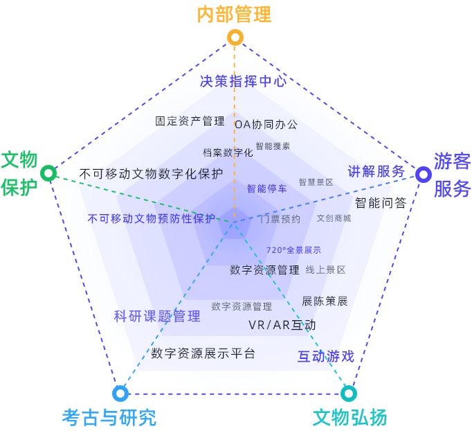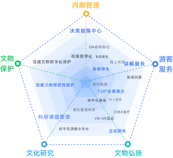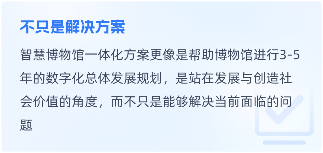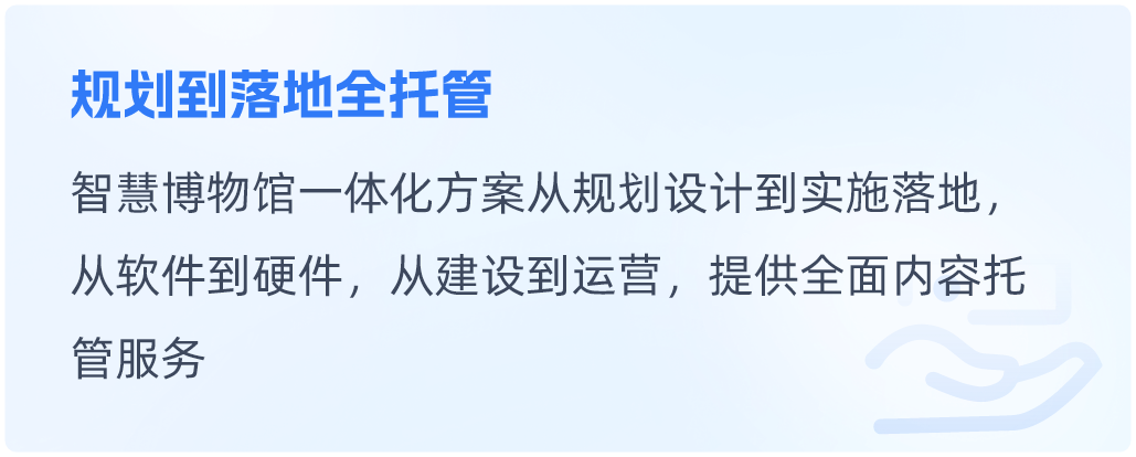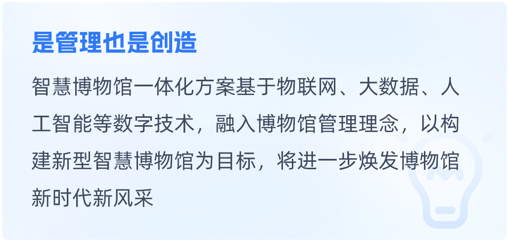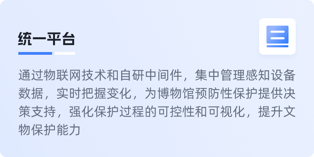 文博行业智慧博物馆一体化解决方案智慧博物馆一体化解决方案围绕博物馆职责与发展,构建文物保护、研究、文化弘扬等多领域内容的一体化解决方案。同时根据每个博物馆的特定职责和工作重点,提供个性化内容。查看详情