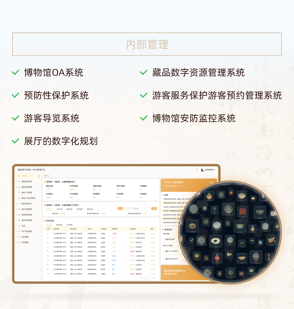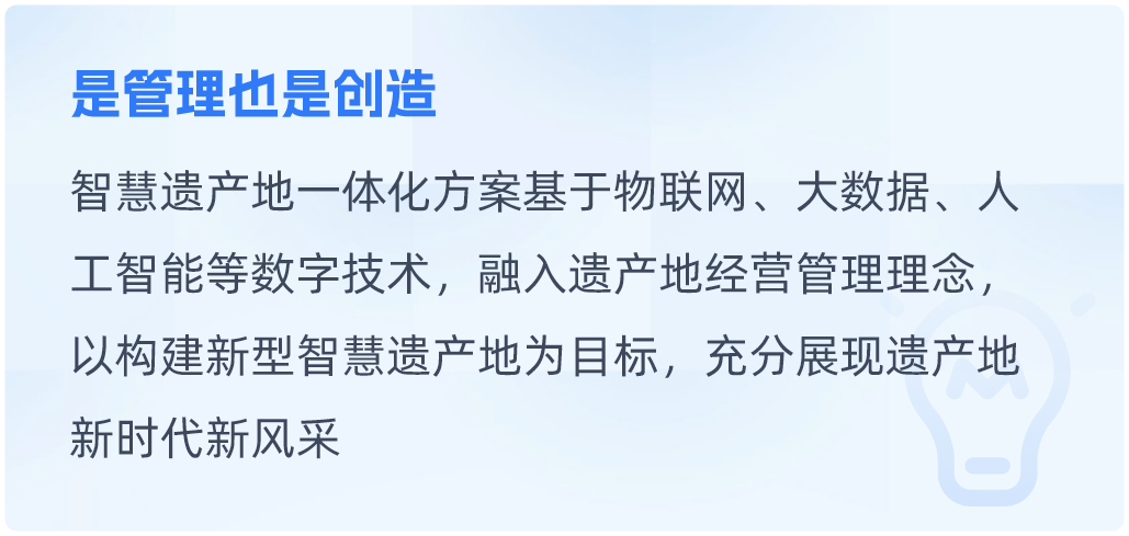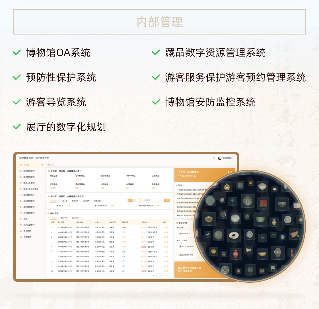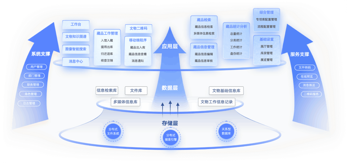 文博行业智慧博物馆一体化解决方案智慧博物馆一体化解决方案围绕博物馆职责与发展,构建文物保护、研究、文化弘扬等多领域内容的一体化解决方案。同时根据每个博物馆的特定职责和工作重点,提供个性化内容。查看详情